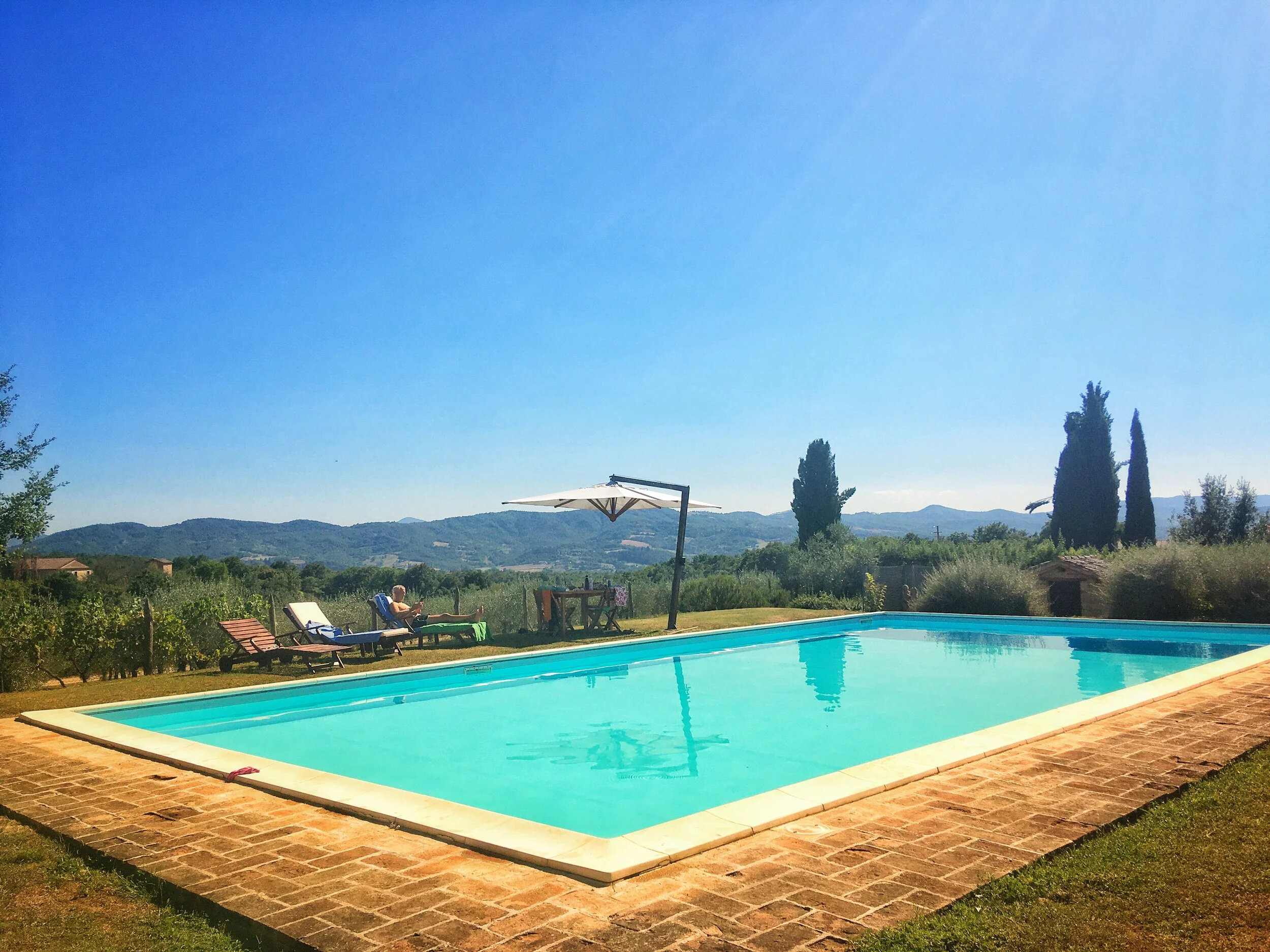 Look at this photograph and put yourself there. Lazing, sun-bathing, reading lay on the sun-bed aside this beautiful pool. Look up and be dazzled by the 180 degree view of beautiful Umbria. And relax ..